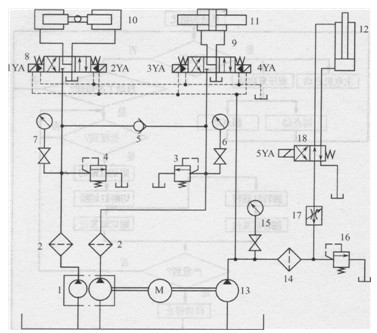 1-雙聯(lián)液壓泵;2、14-精過濾器;3、4、16-溢流閥;5-單向閥;6、7、15-壓力表及其開關;8. 9-_位四通電液換向閥;10-切斷液壓缸;ll-跟切液壓缸;12-翻轉(zhuǎn)液壓缸; 13-定量液壓泵;17-調(diào)速閥;18-二位四通電磁換向閥