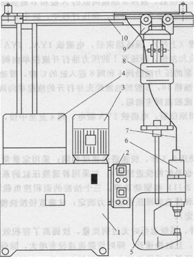 1-油箱;2-電氣控制箱;3-電動(dòng)機(jī);4-液壓發(fā)生器;5-鉚鉗;6-液壓缸 7-油管;8一懇吊裝置;9-小車;1O-導(dǎo)線