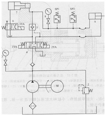 1-定量液壓泵; 2-溢流閥;3、8-壓力表及其開關(guān);4-一位四通電磁換向閥;5-液控單向閥;6–二位四通電磁換向閥;7-增壓器;9-動(dòng)力液壓缸, SP1、SP2-壓力繼電器