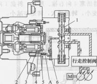 ①開始行走時[圖]。操作行走操縱桿時,來自泵的壓力油啟動平衡閥(背壓閥)的滑閥1,打開到停車制動器的油路,并流人制動活塞5的腔A。壓力油克服彈簧2的力,并按箭頭方向將活塞5向左推,將摩擦片4和摩擦盤3推到一起的壓緊力消失,所以摩