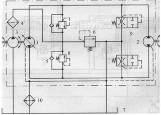 1-雙向變量柱塞泵;2-雙向定量馬達(dá);3-低壓齒輪泵;4-過(guò)濾器;5-單向閥 6-補(bǔ)油溢流閥;7-油箱;8-溢流閥;9-中位閥;10-冷卻器.