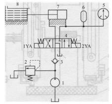 1-定量液壓泵;2-溢流閥;3-單向閥;4-三位四通電磁換向閥; 5-電接點(diǎn)壓力表;6-蓄能器;7-液壓缸;8-丁基膠缸