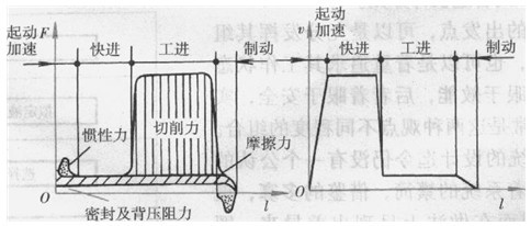 對液壓系統(tǒng)進行工況分析,就是要查日爿它的每個執(zhí)行元件在各自工作過程中的運動速度和負載的變化規(guī)律,這是滿足主機規(guī)定的動作要求和承載能力所必需具備的。液壓系統(tǒng)承受的負載可由主機的規(guī)格規(guī)定,可由樣機通過實驗測定,也可以由理論分析確定。當用理論分析確定系統(tǒng)的實際負載時,必須仔細考慮它所有的組成項目,例如:工作負載(切削力、擠壓力、彈性塑性變形抗力、重力等)、慣性負載和阻力負載(摩擦力、背壓力)等,并把它們繪制成圖,如圖11-2a所示。同樣地,液壓執(zhí)行元件在各動作階段內的運動速度也須相應地繪制成圖,如圖11-2b所示。設計簡單的液壓系統(tǒng)時,這兩種圖可以省略不畫。
