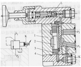 2)與單向閥組成平衡閥,保持垂直放置的液壓缸不因自重而下落。它的工作原理可見第九章圖9-5。