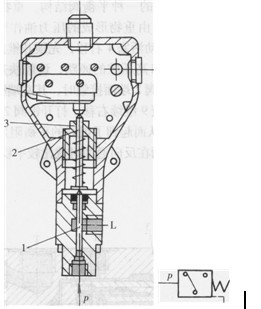 圖6-34所示為柱塞式壓力繼電器的結(jié)構(gòu)。當(dāng)油液壓力達(dá)到壓力繼電器的設(shè)定壓力時,作用在柱塞1上的力通過頂桿2合上微動開關(guān)4,發(fā)出電信號。