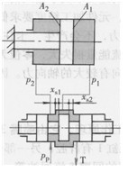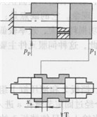 圖6-40a為單邊滑閥控制式,它有一個控制邊?;钊系淖枘徭軱使液壓缸左右兩腔相通。控制邊的開口量x。控制了缸中油液的壓力和流量,從而改變了缸的運動速度和方向。