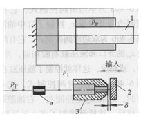 圖6-42所示為噴嘴.擋板裝置的工作原理。它由噴嘴3、擋板2和液壓缸1組成。液壓泵來的壓力油p。一部分直接進入液壓缸1有桿腔,另一部分經(jīng)過固定節(jié)流孔a進入液壓缸1的無桿腔,并有一部分經(jīng)噴嘴一擋板間的間隙6流回油箱。當(dāng)輸入信號使擋板2的位置(亦即是鰳改變時,噴嘴.擋板間的節(jié)流阻力發(fā)生變化,液壓缸1無桿腔的壓力p.亦發(fā)生變化,液壓缸1就產(chǎn)生相應(yīng)的運動。