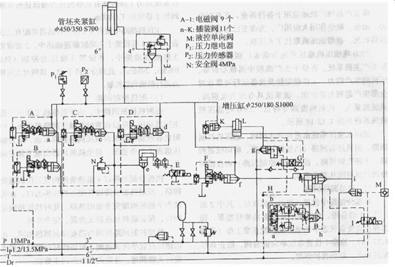 設(shè)計(jì)最快生產(chǎn)節(jié)奏為27s/根,夾緊缸尺寸Φ450mm/Φ350mm,行程700mm,要求夾緊缸必須快速工作,工作流量2.23×l0^3L/min,故夾緊回路采用了大流量的插裝回路及一臺(tái)螺桿泵(1 35×l0^3L/min,1,2/3.5MPa)供油。整個(gè)回路的控制壓力為13MPa,供管坯夾緊回路的壓力為13MPa。