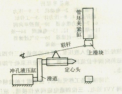 熱定心裝置如圖2所示。此裝置不管管坯的尺寸如何,始終能自動(dòng)地在管坯端面中心沖出一個(gè)孔。管坯被夾緊缸夾緊后,由另一液壓缸推動(dòng)定心頭對(duì)管坯前端面沖孔,由于管坯的尺寸不同,所需的爽緊力不一樣,在設(shè)計(jì)上采用了壓力型插裝閥及增壓缸,可使最大夾緊力達(dá)到2.94kN。