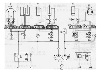 1)起動——將發(fā)動機(jī)與泵的離合器接合,按下起動鍵。這時電磁溢流閥l、4通電,使泵2、3處于待工作狀態(tài)(卸荷狀態(tài));