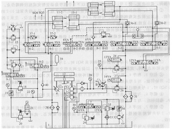 1-油箱;2電液比例雙向變繁軸向柱塞泵;3一三聯(lián)齒輪泵組;4-單向變量泵, 5-1、5-2-主推缸二位舊通電液換向閥組;6-1、6-2一夾緊缸二位四通電磁換向閥組; 7-冷卻油路控制閥組;8-1、8-2-補(bǔ)油二位四通電液換向閥組; 9-1、9-2一卷纜液壓馬達(dá)三位四通手動換向閥組;10-1. 10-2-1號夾鉗液壓缸組; 11-1、11-2—2號夾鉗液壓缸組;12-柴油發(fā)動機(jī);13-齒輪箱;14-卷纜雙向定量液壓馬達(dá);15緩沖溢流閥組;16一液控順序閥;17、40單向閥;18、29、35-溢流閥; l9、34-調(diào)速閥;20、23、26先導(dǎo)式溢流閥;21、24、27一二位二通電磁換向閥; 22、25、28、30-壓力表;31、38同油過濾器;32冷卻液壓泵,33冷卻器; 36-1、36-2液控單向閥, 37-1、37-2一壓力繼電器;39一蓄能器