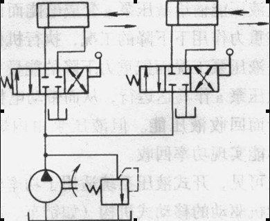 如下圖所示。液壓泵排出的油同時向兩個或兩個以上的執(zhí)行器供油,而其回油則分別回油箱。這種系統(tǒng)的特點是各執(zhí)行器的速度隨負(fù)載變化而改變。負(fù)載大,則速度減小。因此并聯(lián)系統(tǒng)只適合于外負(fù)載變化較小或?qū)?zhí)行機構(gòu)運動速度要求不嚴(yán)的場合。
