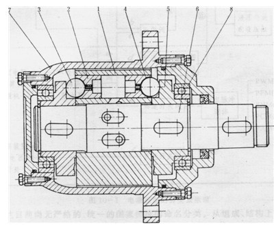 1-缸體;2、4球墊;3-鋼球;5-凸輪盤,6-配流軸;7-殼體;8-軸承