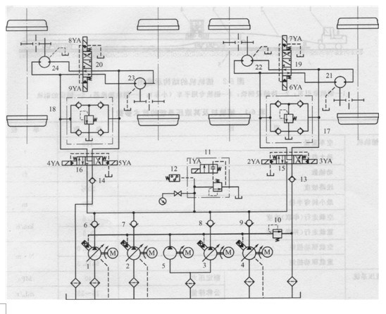 1、2、3、4-變量液壓泵;5-定量液壓泵;6、7、8、9、13、14-單向閥;10-溢流閥 11-電磁溢流閥;12 -壓力繼電器;15、16、19、20-三位四通電液換向閥; 17、18-緩沖補油閥;21、22、23、24-雙向定量液壓馬達