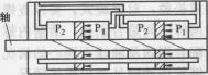 ②活塞螺旋式擺動(dòng)液壓馬達(dá) 活塞與螺桿(輸出軸)組成螺旋副(圖9P13),當(dāng)壓力油從A口進(jìn)入、B口回油時(shí),推動(dòng)兩活塞向左移動(dòng),根據(jù)螺桿螺母副的傳力和運(yùn)動(dòng)法則,當(dāng)螺母(此處為活塞)移動(dòng)時(shí),螺桿(此處為輸出軸)產(chǎn)生轉(zhuǎn)動(dòng);壓力油反向從B口進(jìn)入時(shí),活塞右行,輸出軸反向轉(zhuǎn)動(dòng)。這種液壓擺動(dòng)缸輸出轉(zhuǎn)矩大,運(yùn)轉(zhuǎn)平穩(wěn),有導(dǎo)向桿導(dǎo)向。但螺紋副密封困難,內(nèi)泄漏大,只能用于低壓。
