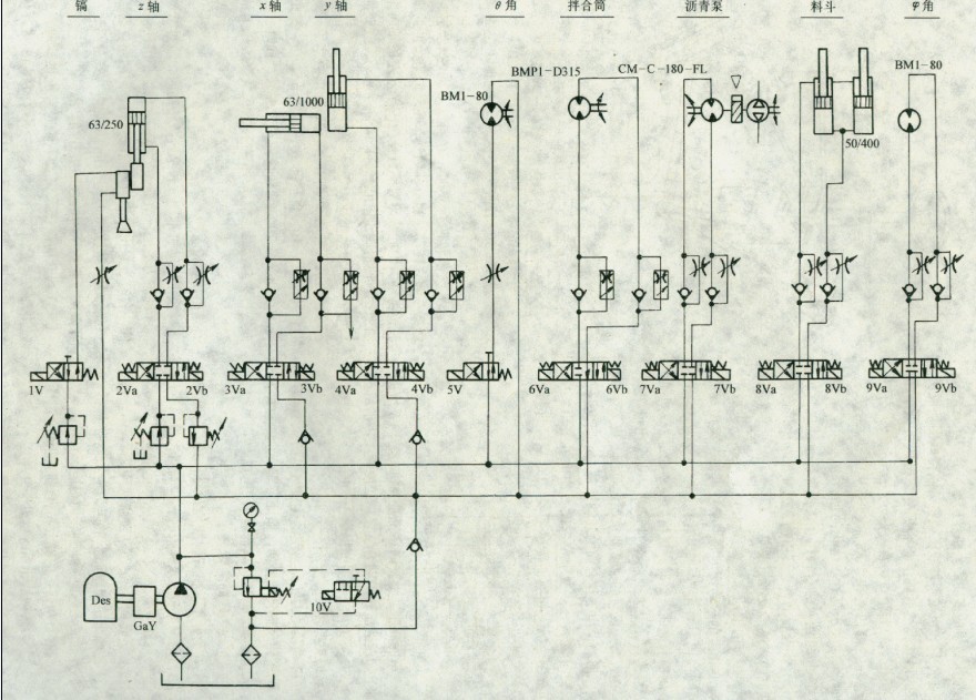 養(yǎng)護(hù)車的液壓系統(tǒng)如圖5所示。機(jī)械手x、y自由度的運(yùn)動速度要求平穩(wěn)可調(diào),采用雙向調(diào)速閥回路。自由度z為液壓鎬的上、下運(yùn)動,當(dāng)液壓鎬向地面進(jìn)給時,進(jìn)給力必須穩(wěn)定,太小影響進(jìn)給速度,太大會將車身頂起,故采用恒定減壓。拌合筒正反轉(zhuǎn)的速度要求穩(wěn)定可調(diào),也采用雙向調(diào)速同路。由于拌臺筒的轉(zhuǎn)動慣量大,三位四通電磁換向閥采用y型中位機(jī)能。整機(jī)可采用集中按鈕控制。加入相應(yīng)的傳感器及PLC,后可進(jìn)行半自動及全自動工作。