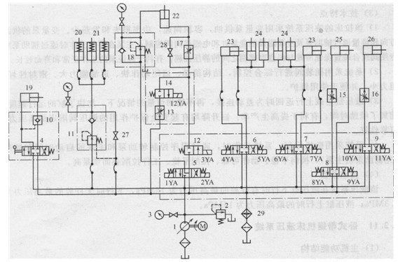 1-限壓式變量叫片泵;2一溢流閥;3一壓力表;4三位四通手動換向閥; 5、6、7、8、9 -三位四通電磁換向閥;10-液控單向閥;11-減壓閥; 12、14-二位二通電磁換向閥;13、l5、16、17調(diào)速閥,18單向減壓閥; 19-鋸條張緊缸;20-導(dǎo)向機構(gòu)鎖緊缸;21鋸條導(dǎo)向缸;22一鋸架升降缸;z3夾緊缸(前后同); 24-頂起缸(前后同);25一前卸料缸;26后送料缸;27、28截止閣;29冷卻器
