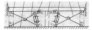 由圖4中可以看出,樂池升降臺的升降臺板1的四周均有導(dǎo)向用的導(dǎo)向墻,而實際中升降臺板四周和導(dǎo)向墻之間的距離一般為20 - 30mm,由于鋼架及升降臺板重量在長度方向的水均勻性和左右鋼架動作時摩擦力等方面的差異,會造成了兩只活寨桿上承受的載荷不問。此外,當(dāng)左、中、右支承塊高度不樣,造成在初始位置時升降臺板已不在水平位置上。上進所有情況,均有可能導(dǎo)致樂池升降臺板運動時的傾斜。越往復(fù)運動,高度方向上的累計誤差越大,傾斜就越厲害。