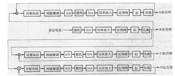 液壓同步提升系統(tǒng)和液壓加載系統(tǒng)用一臺PC工業(yè)控制機控制。其同步提升控制框圖見圖4.14-12。其中B缸為主令液壓缸,它的速度直接給定。由傳感器測得的高差、油壓等模擬信號和缸位置、錨具位置等系統(tǒng)的狀態(tài)參數(shù)輸入給計算機,通過計算機分析,按照預(yù)先編制的控制程序輸出一定的控制電流給各電液比例調(diào)速閥,從而確定A、C、D各缸的速度。負載位移通過負反饋反饋到輸入端,形成負反饋閉環(huán)控制系統(tǒng)。加載控制為開環(huán)控制,負載大小由預(yù)先輸入到計算機的參數(shù)確定。計算機根據(jù)參數(shù)值輸出相應(yīng)的電流到電液比例溢流閥,從而決定加載力的大小。