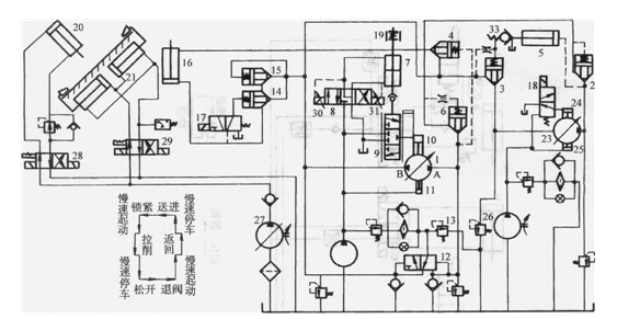 在圖1中,液壓缸7,液壓缸13和液壓缸17分別控制三個(gè)滑臺(tái)。液壓缸14為夾緊缸,液壓缸15為輸送工件液壓缸,液壓缸l6為定位缸。由三位四通或二位四通換向閥分別控制各液壓缸的往復(fù)運(yùn)動(dòng)。在油路中可以不接人調(diào)速閥,可以接入一個(gè)調(diào)速閥(如液壓缸13,液壓缸17的油路),也可接人兩個(gè)串聯(lián)的調(diào)速閥(如液壓缸7、液壓缸15的油路),用這種方法使液壓缸7、液壓缸13、液壓缸17進(jìn)行速度換接完成快進(jìn)、工進(jìn)I和工進(jìn)Ⅱ等動(dòng)作,同時(shí)還可使液壓缸15在每個(gè)方向上完成常速和緩沖的速度換接。