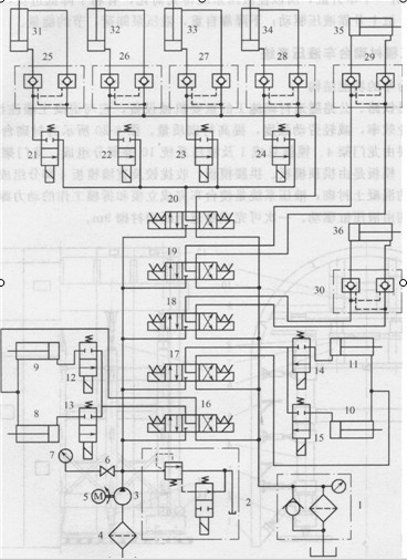 1-回油過濾器;2-電磁溢流閥;3-齒輪泵;4-網(wǎng)式吸油過濾器;5-電動(dòng)機(jī);6-壓力表開關(guān);7壓力表8、9、10、11-側(cè)向液壓缸12、13、14、15、21、22、23、24二位二通電磁換向閥;16、17、18、19、20-三位四通電磁換向閥;25、26、27、28、29、30-雙向液壓鎖; 31、32、33、34-豎向液壓缸;35、36-水平液壓缸