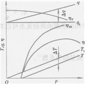 式(4—4)表明:泵的輸出壓力愈高,流量損失系數(shù)愈大,或泵的排量愈小,轉(zhuǎn)速愈低,則泵的容積效率也愈低。