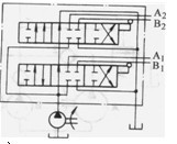 圖1. 3-7為串聯(lián)一獨(dú)聯(lián)系統(tǒng)。多路閥A控制的執(zhí)行機(jī)構(gòu)互相串聯(lián),多路閥B控制的執(zhí)行機(jī)構(gòu)也互相串聯(lián),這兩個串聯(lián)系統(tǒng)之間則由閥1使它們相獨(dú)聯(lián)。這樣在B閥操縱的執(zhí)行機(jī)構(gòu)動作時(shí),不致因誤操作A閥而引起A閥控制的執(zhí)行機(jī)構(gòu)誤動作導(dǎo)致事故。
