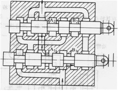 復(fù)聯(lián)系統(tǒng)是以上三種系統(tǒng)的組合,如并聯(lián)一獨(dú)聯(lián)、串聯(lián)一獨(dú)聯(lián)、串聯(lián)一并聯(lián)等系統(tǒng)。圖1. 3-6為并聯(lián)一獨(dú)聯(lián)系統(tǒng)。多路閥A控制一部分并聯(lián)的液壓執(zhí)行機(jī)構(gòu)。多路閥B則控制另一部分并聯(lián)的液壓執(zhí)行機(jī)構(gòu)。但兩個多路閥所控制的執(zhí)行機(jī)構(gòu)之間是相互獨(dú)立的。所以在B閥操縱的執(zhí)行機(jī)構(gòu)動作時(shí),即使誤操作A閥,也不會使A閥控制的執(zhí)行機(jī)構(gòu)誤動作。