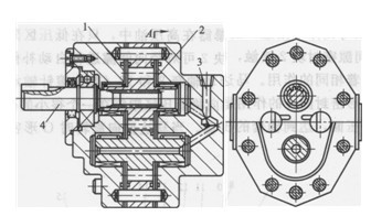 圖1固定間隙的齒輪液壓馬達結構 1,2-側板;3-泄漏油孔;4-輸出軸