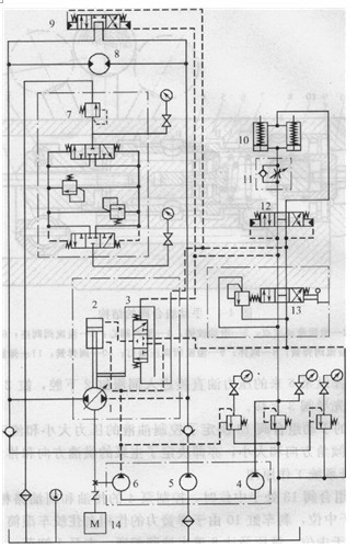 1-雙向伺服變量液壓泵(主泵);2一伺服缸;3一先導(dǎo)閥;4一控制泵;5一補(bǔ)油泵; 6-操縱泵; 7-雙向溢流閥;8-雙向定量液壓馬達(dá);9、12-三位四通液動(dòng)換向閥 10-剎車液壓缸;11-單向液阻器;13-手動(dòng)組合閥;14-柴油機(jī)
