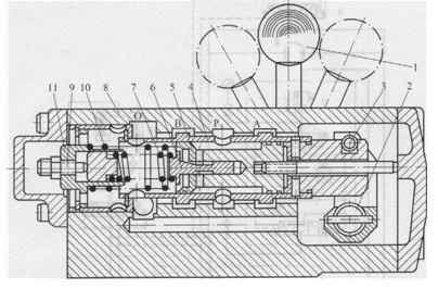1-操作手柄; 2-滑閥滑動(dòng)支點(diǎn);3一滑動(dòng)鉸鏈;4滑閥閥心;5一溢流閥閥座; 6一溢流閥閥心7溢流閥彈簧;8閥體;9一溢流閥調(diào)壓螺釘;10-閥彈簧;11-彈簧座